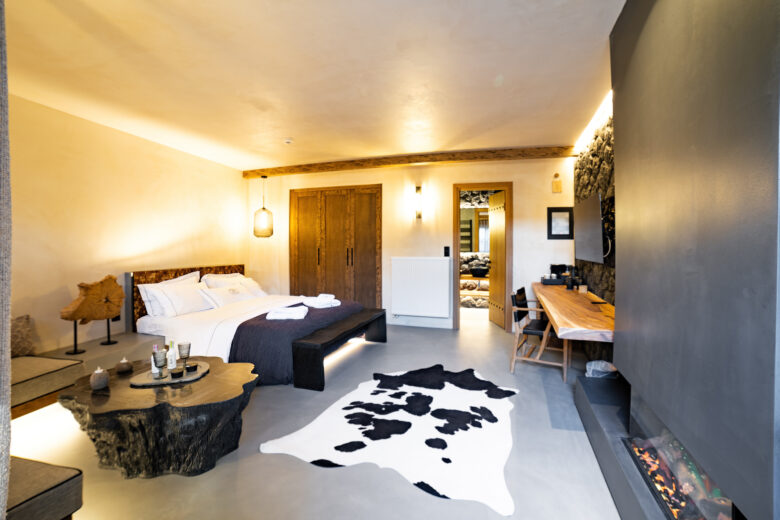Nestled within the enchanting Arachova landscape, the boutique mountain chalet boasts a room that harmonizes luxury with rustic charm. Natural sunlight filters through the windows, illuminating the cozy space adorned with locally crafted wooden furnishings. Plush, earth-toned fabrics cocoon the bed, inviting weary travelers to sink into relaxation.